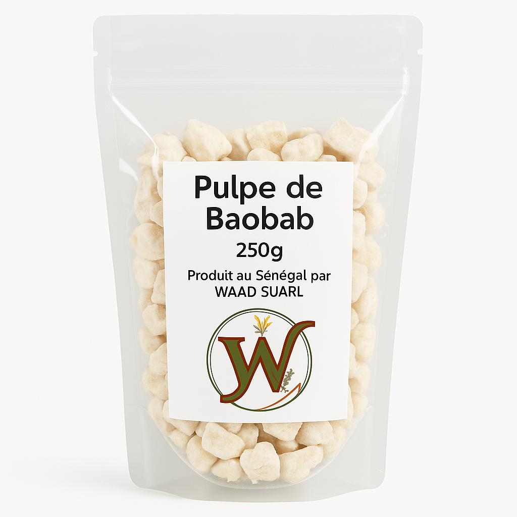 Découvrez la Pulpe de Baobab 250g, un super-aliment naturel directement issu du fruit du baobab, arbre emblématique d’Afrique. Transformée au Sénégal par WAAD SUARL, notre pulpe est riche en vitamine C, fibres, calcium et antioxydants, pour une alimentation saine et énergisante.